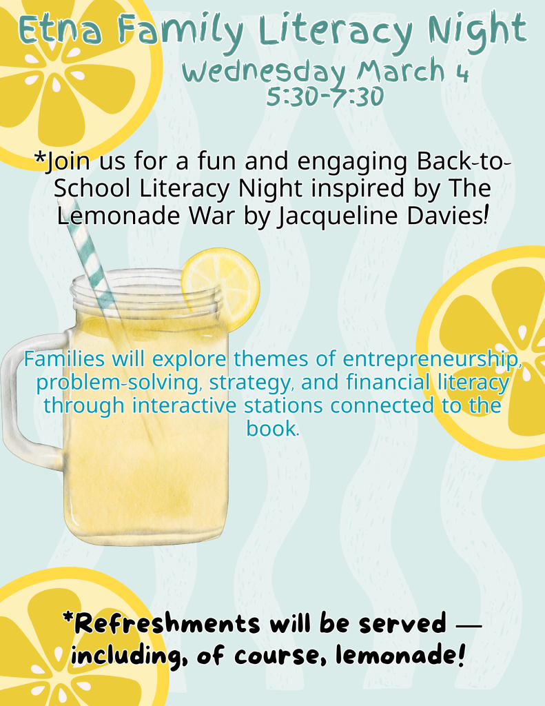 March 2-5: Literacy Week! One School, One Book – The Lemonade War. See flyers for dress-up days and Family Literacy Night!